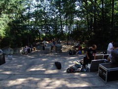 Aber erstmal sollte die Bühne stehen, leider muss man hier alle Kisten über die gesamte Zuschauertribüne schleppen, damit wird das Aufbauen endgültig zum Leistungssport.